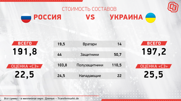 Если верить текущим ценам на сайте transfermarkt.de, то сборная России уступает соседям по цене состава совсем чуть-чуть. Но после крупных турниров стоимости всегда обновляются и провалившиеся команды становятся дешевле, а приятно удивившие — дороже. Нет сомнений, что наша команда упадет в цене, а многим украинским сборникам повысят стоимость.