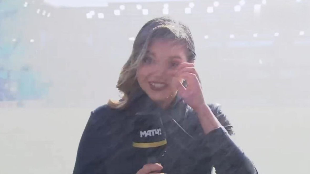 В прямом эфире «Матч Премьер» показали, как журналистка Анастасия Климкина попала под мощный напор воды из дождевальной машины на стадионе «Газовик» в Оренбурге.
